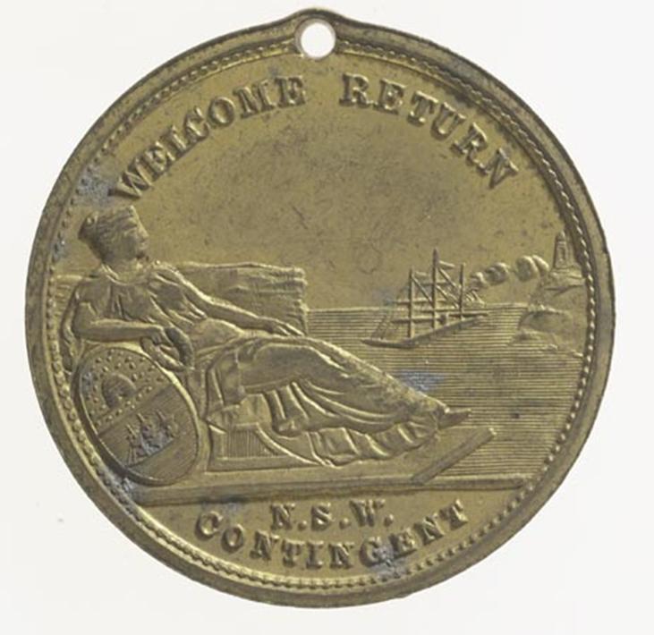 This medal was issued by T. Playfair, Lord Mayor of Sydney from 1875 to 1893. It was presented to each member of the contingent which fought in the Soudan, who were expected to engrave their own name, number or insignia on the medal. Fredrick Rowe engraved his name on this medal. Rowe was born in St Georges, Somerset, England, in 1865. He moved to Australia some time in his youth, and became a labourer. He enlisted to fight in the first war to which colonial Australia had formally sent a force, the Soudan conflict. Rowe enlisted on 01/10/1883 at 18 years 11 months, and embarked on 03/03/1885. He returned to Australia on 23/06/1885 aboard the SS Arab. Inscriptions: Plain (edge) SOUDAN (on tab); I TAKE BUT I SURRENDER/E.JONES; Engraved FREDRICK ROWE above Aborigine and European who hold a shield between them (obverse) .PRESENTED BY THE CITIZENS OF SYDNEY./ T.PLAYFAIR. MAYOR,1885 around wreath; within: engraved NSWA (reverse)