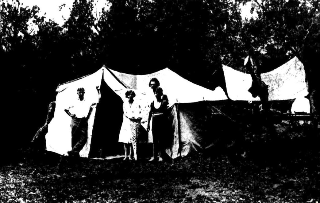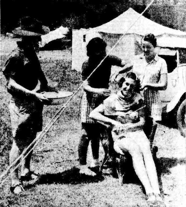 I called at a smart green and white tent which Mrs. Elsie O'Day, of Arncliffe, her husband, and three small children, are sharing with Mr. and Mrs. H. Bowden, of Ashfield, for six weeks of the school holidays. They conducted me through the tent which was divided by curtains into three rooms. The bedrooms contained folding beds and collapsible wardrobes and cabinet. Hand mirrors were fastened to tent poles. In the living room they have a long folding table, seven folding chairs, an ex-army ice food box, and a folding food cabinet. "We have made full use of army equipment," Mrs. O'Day said. "The ice box was one that was used in the front line for keeping food hot for the troops, but makes a perfect ice chest."