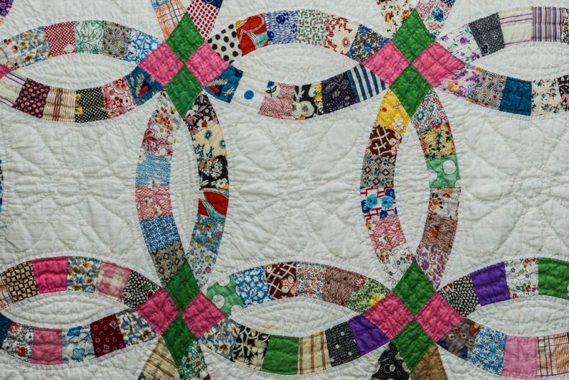Another of Trish’s quilts is the Wedding Ring Quilt (see photo). Trish explains that quilt made in the 1930’s and the lady who owned it was Mary Lou Hassett and she was given the quilt by her mother known as Grandma Partick as a wedding gift. So her mother made it from feedsack. When Mary Lou died, her son was not into quilts and sold it to Trish Bloomfield.