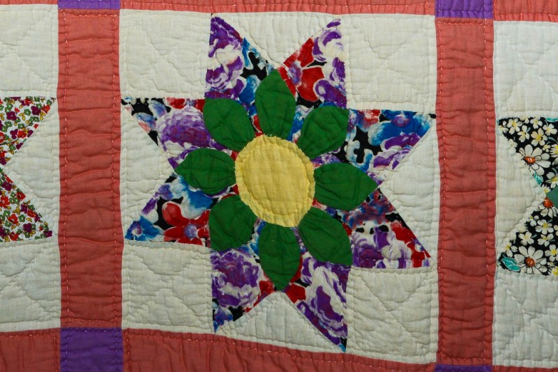 Trish Bloomfield collector of several of the American quilts on display explains that often the story behind the quilt is very interesting. The story behind Nadine’s Quilt made by Nadine’s mother Voila Gearin tells of a cigarette burn on the quilt demonstrating that the quilt was in use and not just as a collectors item. Nadine herself was successful in what was then a man’s world in becoming the Director of Athletics at the University of Tennessee. Quite often really boring quilts have such interesting backgrounds say Trish. The quilt left Nadine’s family when her estate was sold and a sports scholarship was founded. I purchased it from a dealer at the estate sale explains Trish and brought it to Australia. Trish would not have purchased the quilt without the story behind it.