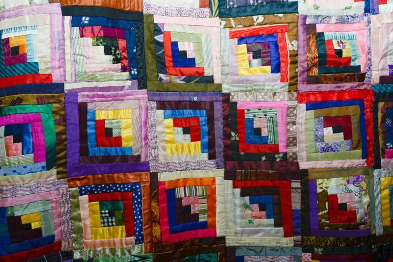 Barn Raising Log Cabin Silk Quilt top is pre 1900. The foundation is pieced on old cottons and silks and was made by Emma Brownbeck. The family home is now Seven Stars Inn, Phoenix.