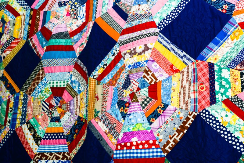 The pattern used in the quilt is called Spiderweb made in the 40’s or 50’s feedsack and dress scraps between 1” and 2” wide. The Spiderweb block is an octagon made up of eight 45 degree angle wedges and a seven inch navy square between each octagon and has been evenly hand-pieced throughout.