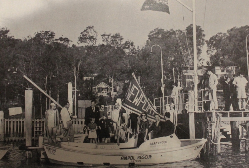 Second Bartender being launched at RMYC by Cmdr. Alan Leslie. Newport SLSC Patrons Kel Harrison, 3rd from left, also includes Bert, Michael and Peter King and Jack Hopper.