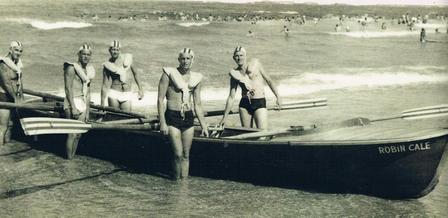 Newport Senior Boat Crew in 1963, from left: Bert King, Hermon Menses, Dave Petley, Ian Wilton and John Kinghorn. Gerry Jeferey remembers that in 1947 Bert was known as 'Killer King' after the boat was rowed from Newport with a rookie crew who did not know how to come aft. The boat was rolled at Bilgola and Bert had to swim ashore using the council line to rescue the crew and the boat. He had trouble getting a crew after that for a while. - Picture from Newport SLSC The First Century 1909 - 2009, compiled by Guy Jennings