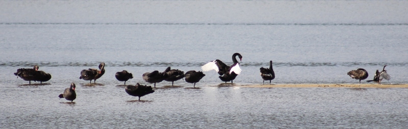 On Monday evening Kerry Smith, Warrieowod bird-watcher for over 50 years, told us there was a flock of black swans on Narrabeen Lagoon. As we happened to be driving past we stopped, and sure enough, a flock of twenty birds could be seen in the distance despite the growing dusk.