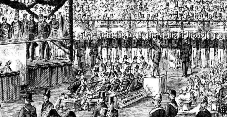 In the centre of the baldachino of the canopy was the coat-of-arms, surmounted with atrophy of flags, and below it the badge of New South Wales sanctioned by the Imperial Government. The committee sat immediately in front of the Governor's dais, and behind them were about 200 girls from different Public schools, dressed in white frocks, with broad blue sashes and sailor hats trimmed with blue. They held bouquets of flowers in their hands, and they formed one of the most pleasing features of the scene. They were flanked by choirs of male voices, about fifty in all. The whole of the space within the enclosure was filled, the trees on the park far and near blossomed with venturesome urchins, who hung out upon the limbs in away that was perilous to themselves and the dense crowd beneath them. Others, again, were contentedly perched upon the arms of gas-lamps and the pillars of the enclosure fence. The roofs of the Grammar School and the Australian Museum were partly covered with clouds of spectators, and on the parapet of the classic pile which forms the western facade of the latter institution was a native of New Guinea, the first who has yet set foot upon the shores of New South Wales; while within the enclosure itself were three youngsters from the Solomon Islands, who are said to be the sons.