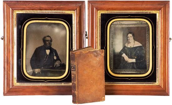Captain Thomas Watson (1795-1879): Pair of photographs, one of Captain Thomas Watson, Harbour Master of Sydney, other of his wife Hannah (taken from an oil painting), both with highlights hand-painted in gold, framed & glazed, each overall 30 x 35 cm. Captain Watson is wearing his 1841 medal for rescuing the boy Forbes from the Savages of Timor. Also included is a book 'Expository Discourses on the Book of Genesis' by Fuller [London, 1836], believed to be ex Hannah Watson - from listing on Antiques reporter website