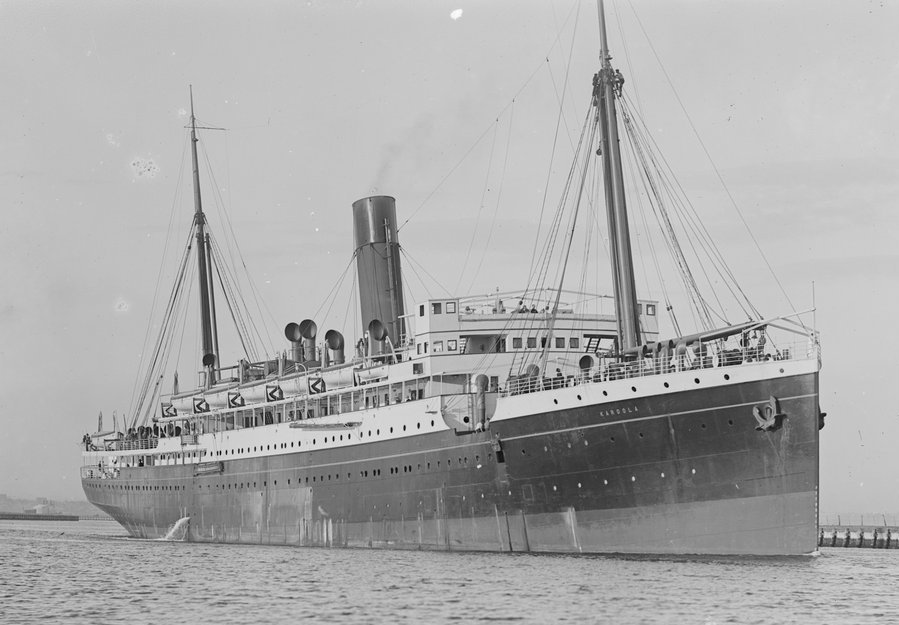 The 9,223-ton S.S. Caledonia was a British passenger ship built for the Anchor Line by David and William Henderson & Company at Glasgow, Scotland. She was launched on 22 October 1904 and plied a tourist route between Glasgow and New York city. When World War I erupted in August 1914, the British government requisitioned Caledonia and converted this once elegant liner into a troop ship. Post conversion, Caledonia could carry 3,074 troops and 212 horses. For more than two years, the ship carried soldiers and their equipment to France and to various locations around the Mediterranean.