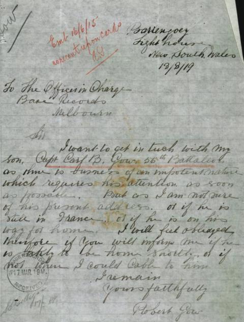 Meanwhile his father, Robert sent a letter from Barrenjoey Lighthouse dated 13.3.1919 requesting information about Carl who is still in France or on way home??? No one knew where he was.