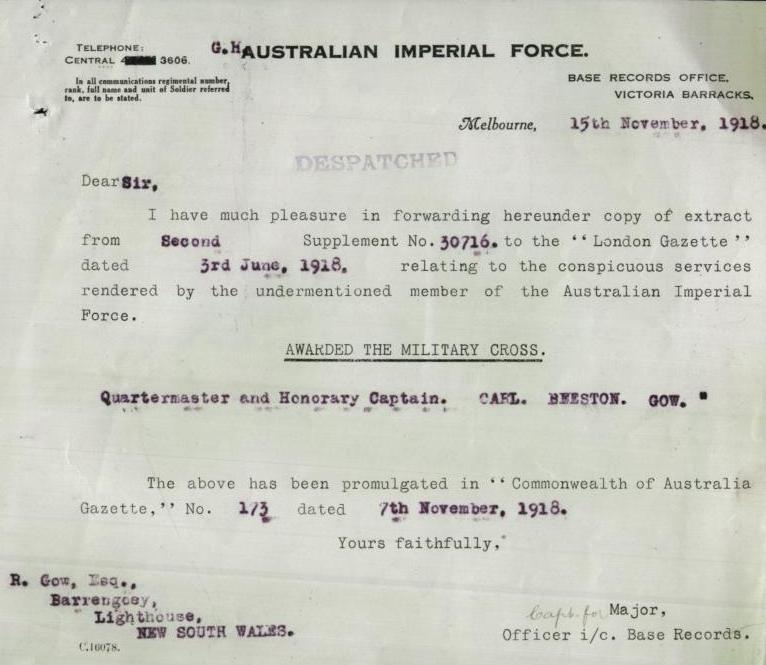 Carl Gow was mentioned in dispatches 25th December 1917; London Gazette; Sir Douglas Haig’s Despatch