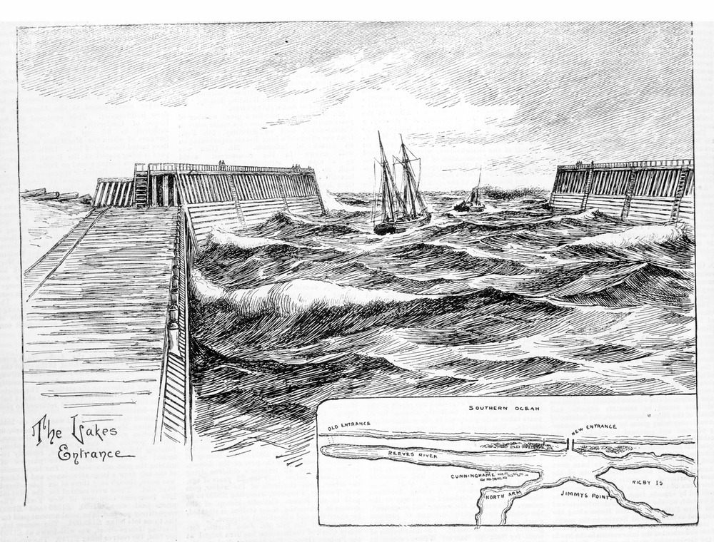 The Inspector.General of PublicWorks, Mr R. Davidson, returned to Bairnsdale yesterday from the Lakes Entrance, after having made a thorough inspection of both piers. The result of his inspection is not known, but we understand the fears entertained of the safety of the works were not without foundation as regards the elbow portion of the eastern pier, which it appears will be a source of trouble for some time to come, owing to the continual sinkage of stone consequent upon the immense scour at that particular point. The Advertiser. (1891, June 11). Bairnsdale Advertiser and Tambo and Omeo Chronicle (Vic. : 1882 - 1918), p. 2 Edition: morning.. Retrieved from http://nla.gov.au/nla.news-article84814902