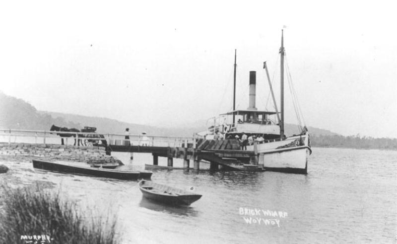 "S.S. Woy Woy" at the Brick Wharf, Woy Woy [rebuilt wharf], 74 tons, b. 1901 by William Dunn, Berrys Bay, N.S.W.