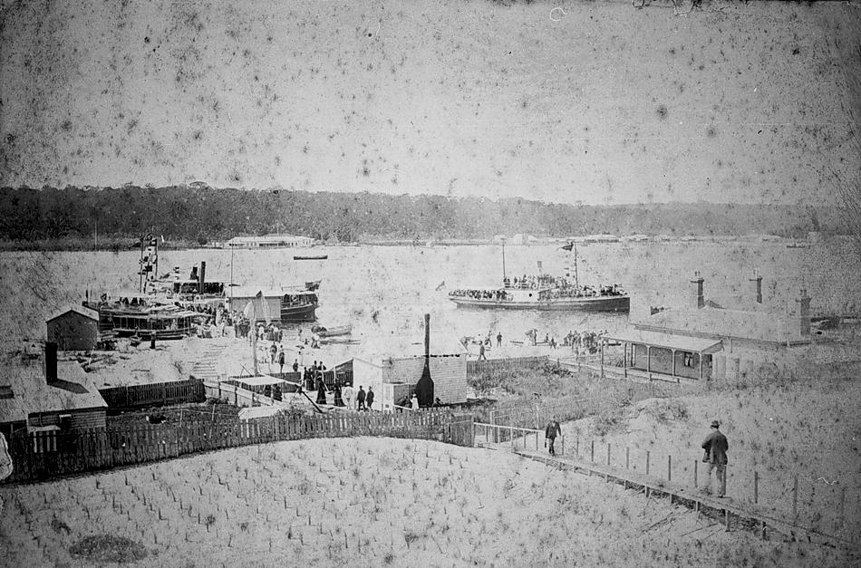 Left: Disembarking from bay steamer, possibly at Sorrento, ca. 1890-ca. 1910, Image No. H83.94/327, courtesy State Library of Victoria.