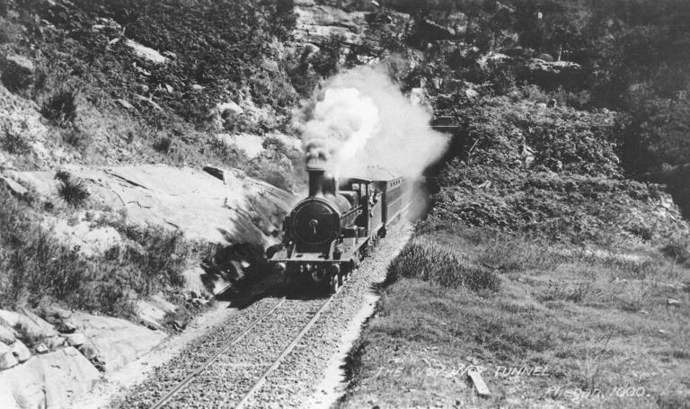 Homebush-Waratah Railway. FIRING THE LAST SHOT IN THE BIG TUNNEL. THE START. The man who conceived the idea of having a demonstration in the centre of a tunnel over a mile long must be a born dramatist, and it is to be regretted that Dion Bouciault left the colony before he could avail himself of the new inspiration. Or Saturday morning at half-past 8 a number of gentlemen, including the members for Wollombi, Gwydir Monaro, and Paddington, Mr. Robert Watkins of the firm of Roberts, Chalmers, and Co., and representatives of the leading journals, including the special artist of the TOWN AND COUNTRY JOURNAL, left the Circular Quay in the fast and favorite trader Charlotte Fenwick, at the invitation of Mr. George Blunt, the contractor for section of the Homebush-Waratah Railway from Mullet Creek, a tributary of the Hawkesbury, to Gosford on Brisbane Water. The importance of the occasion it is difficult to over-estimate. The tunnel lies through a hill separating Mullet Creek from Woy Woy Creek, and it is a mile and four chains in length, nearly the whole of which consists of hard blue metal. For two years and four months Mr. Blunt and his overseers and a huge staff of men have ceaselessly, with the exception of the usual cessation from Saturday midnight till Sunday midnight, worked on at this stupendous job. Not only had the solid mass to be pierced and the stuff carted out, but the aperture when finished will be bricked throughout in one continuous arch. Some reflection is necessary to even imagine the details of this, the far and away most arduous job in tunnel making ever accomplished in Australasia, and it might not be a bad thing to make in our public schools a calculation as to the number of tons of stone excavated and bricks used, a subject for determination.