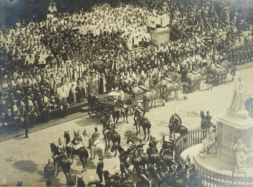 The procession for Queen Victoria's Diamond Jubilee on June 22, 1897 was one of the greatest military parades of all time. The six-mile route through London was thronged by spectators, and millions of people witness the incredible spectacle. Here she is shown arriving at St Paul's Cathedral prior to the Thanksgiving Service in honour of her Diamond Jubilee. She is sitting in the carriage, holding an umbrella, along with her daughter Princess Helena and Alexandra, Princess of Wales. Supplied by Royal Collection Trust / © Her Majesty Queen Elizabeth II 2012
