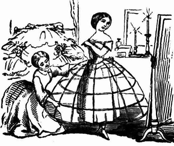 The cage crinoline was adopted with enthusiasm: the numerous petticoats, even the stiffened or hooped ones, were heavy, bulky and generally uncomfortable, while the crinoline was light—it only required one or two petticoats worn over the top to prevent the steel bands appearing as ridges in the skirt—and freed the wearer's legs from tangling petticoats. (1.)