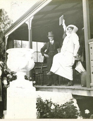 Above: Balcony photo of(from left): George Armstrong, Mrs Hugh Ward, Mr Chalmers, AW Allen, Madame Melba, John Lemmone, Mrs Armstrong, Hugh J Ward. Pic No: a3293014h Album 64: Photographs of the Allen family, 23 August 1914 - 7 March 1915 , courtesy State Library of NSW.