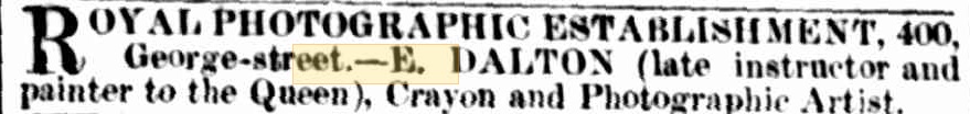 B. WILLIAM BRADLEY having sold his business to his old and valued friend Mr. DAVID SCOTT, has great pleasure in recommending that gentleman to his numerous patrons, and respectfully begs to assure them that Mr. David Scott will be certain to produce portraits in all reflects equal to those taken by himself, as, in addition to his natural taste and long experience as an artistic photographer, Mr. Scott is in possession of the entire formula and processes used by Mr. Bradley with such great success. And, in addition to this, Mr. Scott has been thoroughly initiated into the exact method of operating practised by Mr. Bradley, and having now taken all the portraits at the above establishment for the last nine months. Many of these portraits being finer than anything that has hitherto been produced in Sydney, Mr. Bradley trusts that this may be taken as a guarantee of Mr. D. Scott's great ability. In conclusion, Mr. Bradley begs to thank his patrons for their favours, to kindly bestowed upon him for so many years past.