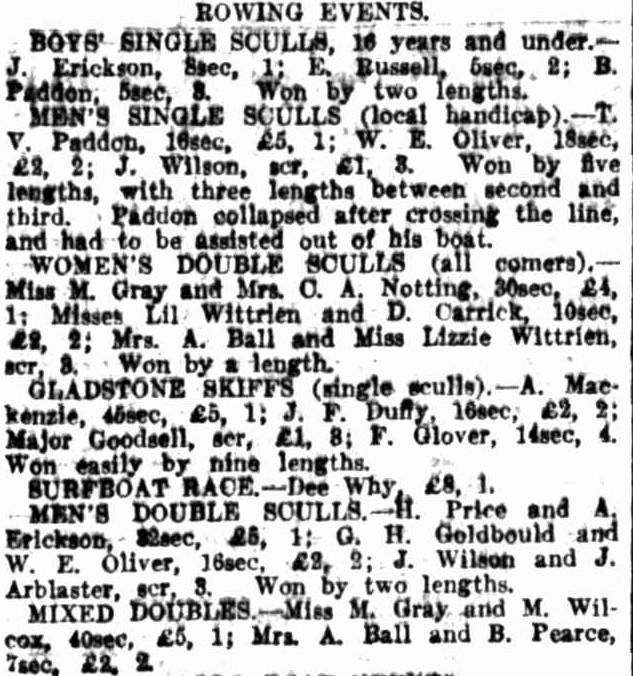 Results :- Rowing Events. Boys' Single Sculls (10 years and under).-- C.Bolton, 1; A. Riddle, 2. Won by three lengths and a half. Boys' 'Single Sculls (14 years and under).-L. Young 1; C. Miles, 2. Won by five lengths. Youths' Single Sculls.-J. F. Duffy, 1; C. Erickson, 2; C. Miles, 3, Won by four lengths. Ladies' Single Sculls Handicap (all-comers) E. Counsell, 1; Miss J. Liddle 2; Miss G.Lewis, 3. Mixed Double Sculls Handicap.-First heat: Miss J. Hastie and J. Milton (15s) 1; Miss E. Counsell and A. Hayden (scr.) 2; Miss V. Bogg and J.S. Hankins (4s) 3. Won easily. Second heat : Miss McKay and G. Jack (4s), 1; Miss N. Counsell and G. McDeritt (8s beh.(, 2; Miss J. Riddle and W Riddle (scr), 3. Won by a length. ( Men's Double Sculls Handicap.-First heat: J. Neilson and C Whitney (25s), 1; H.Walters and J. Krance (17s), 2; W. Riddle and J. Riddle (scr.) 3. Won by about four lengths. Second heat: J. Duff and A. Ollivier (25s.), 1; G.Godbolt and W.Johnson (30s.), 2; 2; W. Wilcox and W. Oliver (10s), 3 Won by two and a half lengths. Old Buffers Single Sculls Handicap. -- J.Wilson (scr), 1; G.Godbolt (20s.). 2; S.Erickson (25s.), 3. Won easily. AQUATICS. (1914, January 5). The Sydney Morning Herald(NSW : 1842 - 1954), p. 12. Retrieved from http://nla.gov.au/nla.news-article15494331