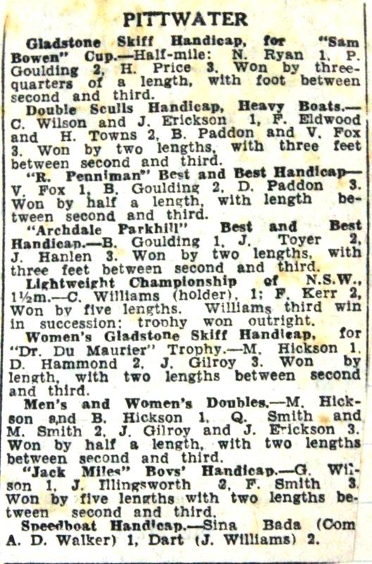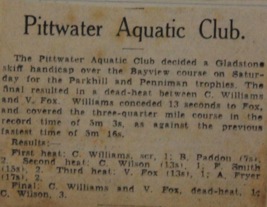 Relay Race for Pittwater Cup.-Clareville (B. Paddon, V. Fox. and C. Mudie), 1; Bayview (C. Williams, F, Kerr, and B. Hickson), 2. PITTWATER AQUATIC CLUB. (1933, November 27). The Sydney Morning Herald (NSW : 1842 - 1954), p. 13. Retrieved from http://nla.gov.au/nla.news-article17027407