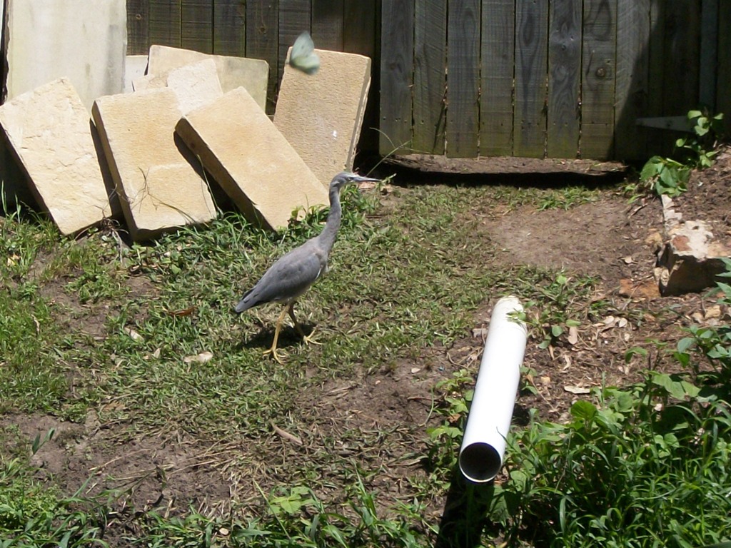 During this week the full cycle of one year in the bird world has been witnessed. The Australian Blue Crane, (also called the White Faced Heron; Egretta novaehollandiae) who was seen in Careel Bay creek for the past two years, and lived there during much of our Winter, and then was seen with a mate, showing this favourite fishing ground in Spring, then spotted in Careel Bay with six other birds in late Spring, some of them quite obviously very young, has now brought two children to the tidal rush in Careel Creek. Again for the fishing.
