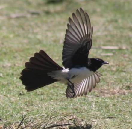 Also seen; Willy Wagtails (Rhipidura leucophrys) stalking, stirring up and rising to air in quick flits while feeding on insects in the recently mowed parts of the ovals at Careel Bay.