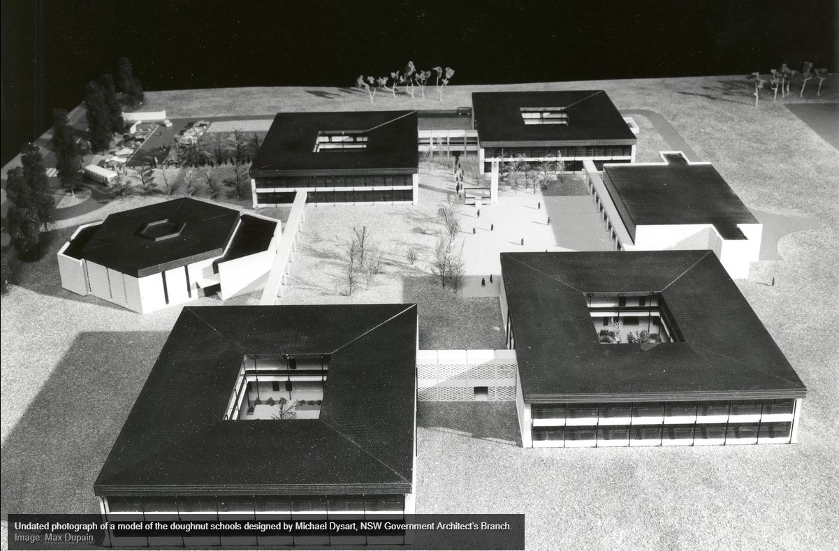 The NSW Government Architect’s Branch met this demand by innovating new designs for high schools which could be built quickly and cheaply. These included the so-called ‘doughnut schools’, designed by Michael Dysart.