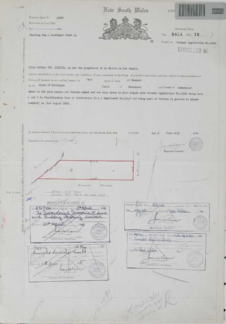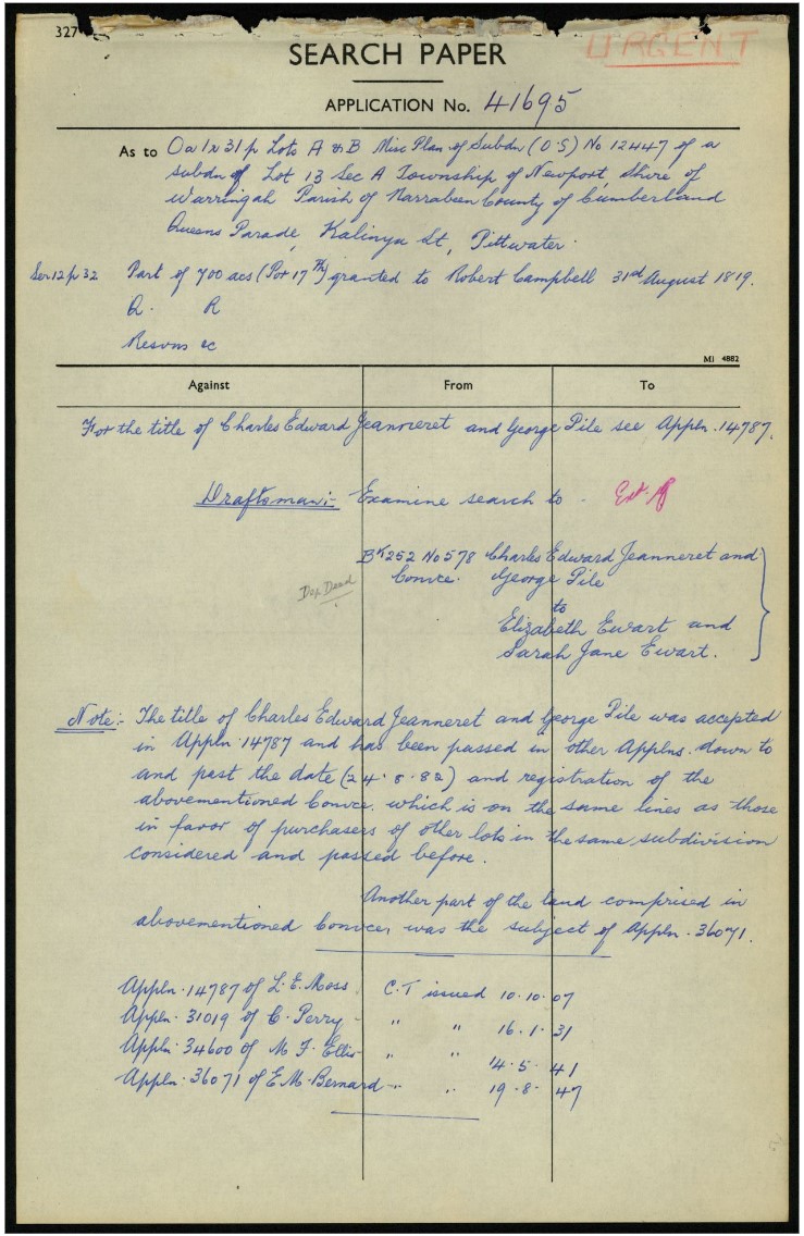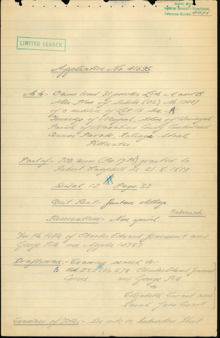 No. 17,812. APPLICANT:—Thomas Henry Hodges, Balmain. LAND:—County Cumberland, parish Narrabeen, shire Warringah, 2 roods 31 ½ perches, Gladstone and Queen streets, Newport,—lots 17 and 18, section C, township Newport, and part 700 acres (portion 17 of parish), granted to Robert Campbell; adjoining properties of M. Johnston and J. Sanderson. NOTICE UNDER REAL PROPERTY ACT. (1912, August 7). Government Gazette of the State of New South Wales (Sydney, NSW : 1901 - 2001), p. 4985. Retrieved from http://nla.gov.au/nla.news-article221605230
