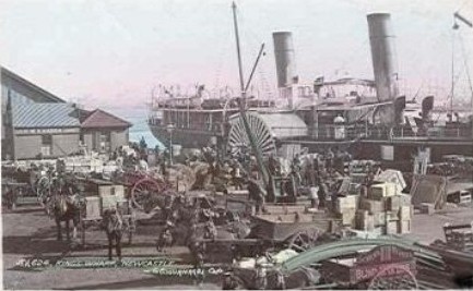 Disembarking at Newport for picnic, circa 1900 (Ferry is the SS Phoenix), 'Newport Wharf '- by Sydney & Ashfield : Broadhurst Post Card Publishers from album: Scenes of Newport, N.S.W, courtesy State Library of NSW