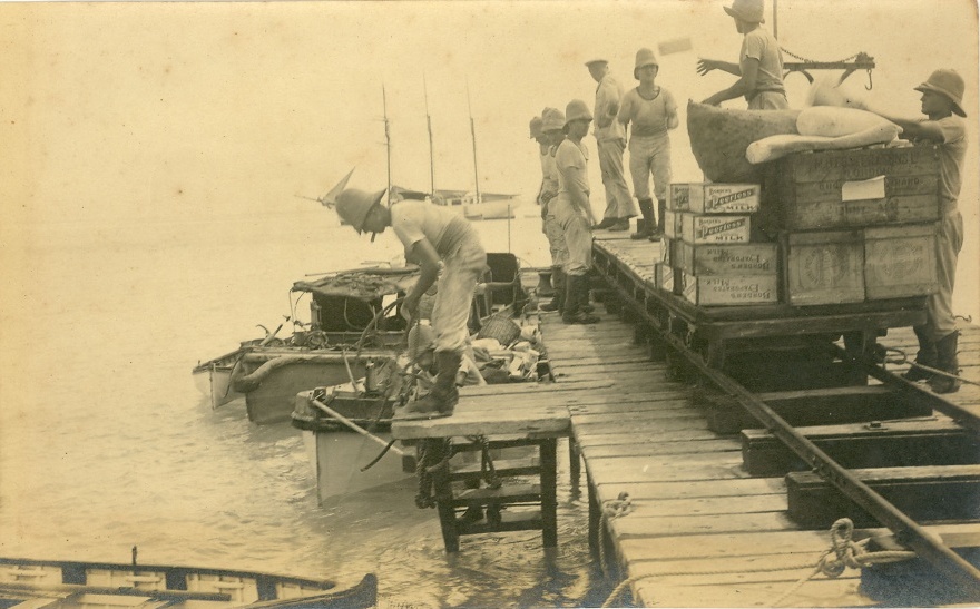 Emden's landing party provisioning the commandeered Ayesha prior to making good their escape., schooner Ayesha is in the background