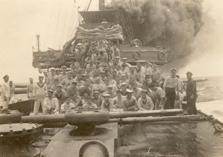 Sydney's crew assembled on her foc'sle shortly after the engagement with Emden.