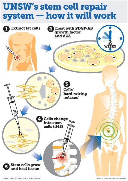 "Spinal implants currently used to replace damaged or troubled discs don't always weld with the adjacent bones, so by transplanting these reprogrammed stem cells, we hope to be able to better fuse these implants to the host bone," Dr Mobbs said.