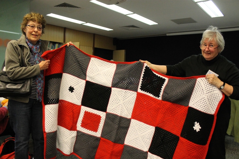 This year, the fifth year Mona Vale Library has hosted Pittwater’s own annual Knit In, providing a yummy morning and afternoon tea, the Pittwater Stitchers, a group of ladies who either knit, sew or crochet every Friday at Mona Vale Library (10am -12) were a little busier then usual. Piles of colourful squares were stacked on tables, crochet hooks, knitting needles and those who are skilled with thread and needles toiled happily at all tables. While we were visiting the ladies one local supporter dropped off a whole ‘wrap’ ready to be finished by being sewed to a backing piece.