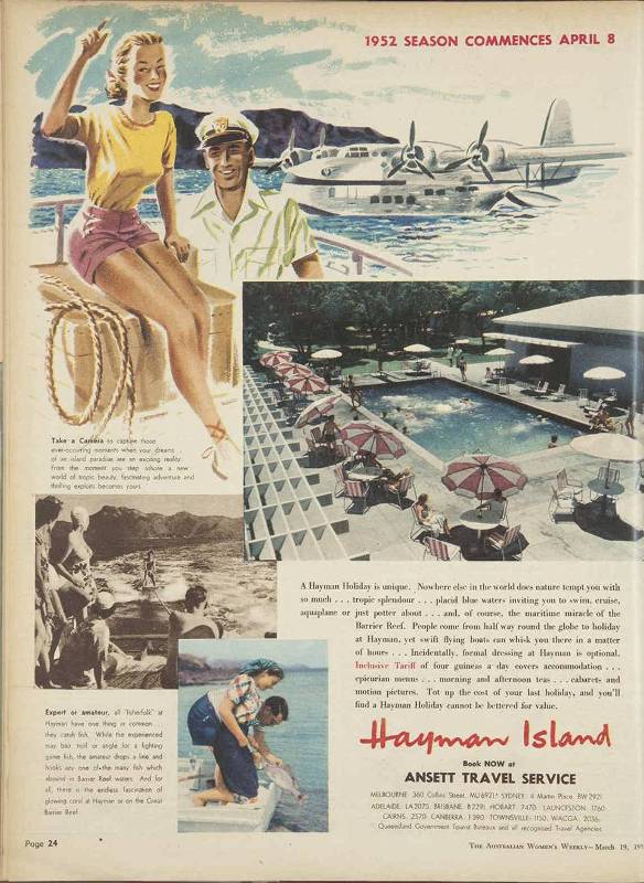 Ansett advertisement for Hayman Island 'swift flying boats can whisk you there in a matter of hours' March 1952 - 1952 version: 1952-03-19 Contributed by National Library of Australia [news-article45646560 via Trove] (The Australian Women's Weekly, 19 March 1952, p 24)