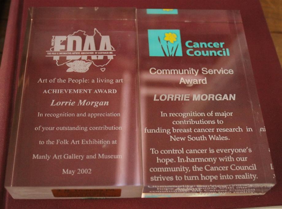 One early one is this from the Cancer Council – a Community Service Award. My early mentor from the China Painting era had a son who was diagnosed with cancer. She taught us to give 10% of what we made from this to the Cancer Council to fund research – so of everything we ever sold this percentage went there.