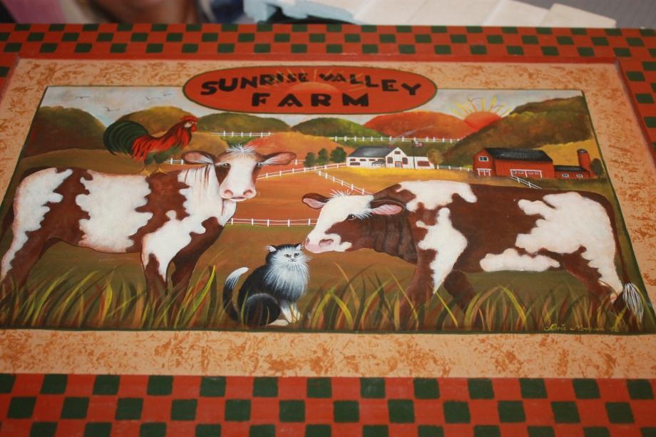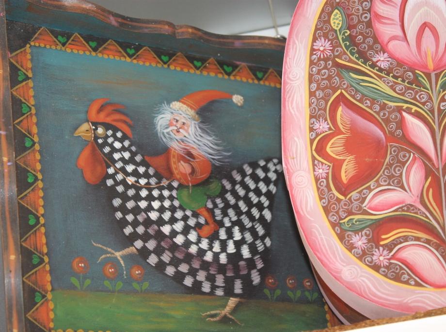 Some of these I did while in America- that chicken with the dwarf, a naughty dwarf – that’s quite an old traditional form that painting, is called ‘Tomptee’. That’s from a Jo Sonja class I did.
