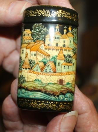 I was fortunate to go to Russia recently with a group of art friends, there were 8 of us and it was fabulous. We hired a kombi in Russia, and a driver and a bodyguard. The 8 of us crammed into the back of this kombi with all our suitcases and went to all the villages where they teach the different styles of Russian painting; Shostovo, Fedoskino, Palekhi, Khoulul and Mstera. We all thought we had died and gone to heaven being surrounded by the beautiful artwork everywhere. Each village has its own style.