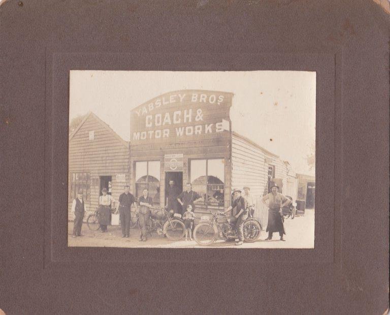 My grandfather Herbert Yabsley sitting on his motorbike in Moss Vale - notice the blacksmith to the right in the picture with the big apron on ....they were still shoeing horses