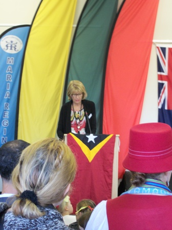 Tamara Sloper Harding, chairlady of PFOS, with the Consul, thanked the Maria Regina students and staff for their initiating this friendship by presenting a framed Certificate of Appreciation that reads ‘ To acknowledge the integral role of the students and staff in the establishment of the friendship between the Pittwater community and that of Soibada, Timor Leste, on the 10th Anniversary of the Independence of Timor-Leste.’