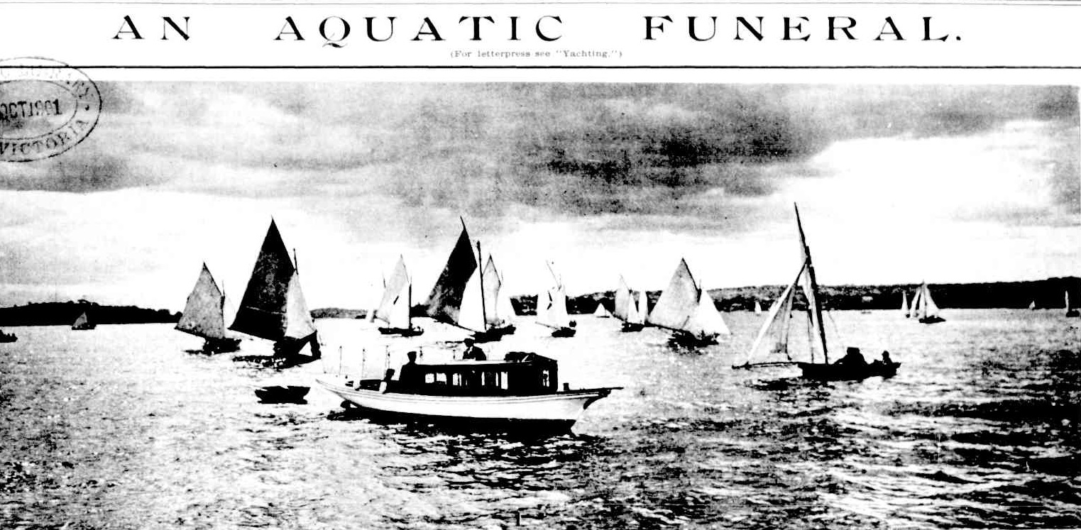 The members of the Sydney Flying Squadron have every reason to be pleased with the success which attended their efforts on Sunday afternoon, to mark, by means of an aquatic funeral, the esteem in which.they held an old comrade, Mr. A. E. G. Thomas, who died at Samarai, New Guinea, twelve months ago. The remains were brought to Sydney for interment, and the members of the squadron, of which Mr. Thomas had been secretary for a number of years (some articles on this funeral state he helped Mark Foy found the club), were determined to mark their appreciation of the great assistance he had been in bringing it to its present successful position, by according his remains a unique and at the -same time a distinctly appropriate funeral. The aquatic ceremony of Sunday afternoon was the first of its kind that has ever taken place on the. waters of Port Jackson. Those who witnessed it, whether from steamers, sailing boats, or the shore, must have been strongly impressed with the picturesqueness of the solemn procession.