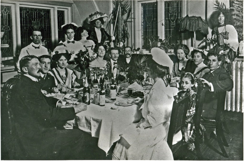 Hydro Majestic staff ball c1910. Notes: Mark Foy, owner of the hotel, standing centre back, wearing his wife's hat and dress with wig. Unknown gent on right in frock and wig with six shooter. Courtesy Blue Mountains City Library