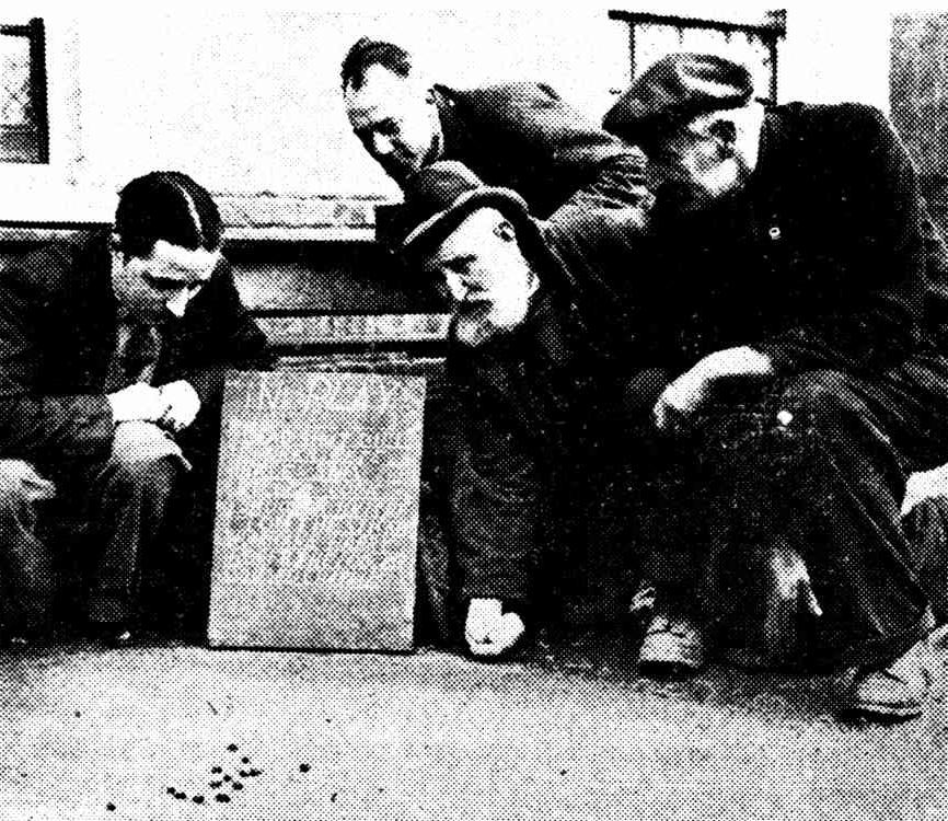 ON GOOD FRIDAY the marbles championship of thee world was decided at the Old Greyhound Inn, at Tinsley Green, Sussex, England. Here is "Uncle" Sam Spooner, 75, who won the championship 50 years ago, showing some of the Tinsley Green team how the game is played. Veteran Shows How Marbles Should be Played (1937, April 7). News (Adelaide, SA : 1923 - 1954), , p. 5. Retrieved fromhttp://nla.gov.au/nla.news-article131201000