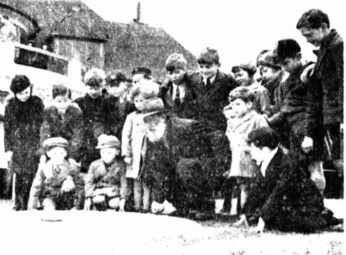 Sam Sponer, 85, who was marbles champion of England 50 years ago, shows his prowess to young admirers. He was present at the English championship — a 350 years' old event played recently at Tinsley Green, Sussex.