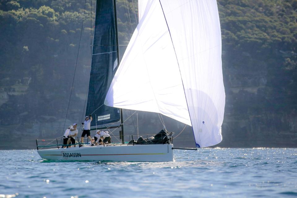 An hour and a half long postponement due to lack of wind came to an end when a light nor’westerly breeze steadily filled in under increasing cloud cover. By that stage crews were antsy and brought a general recall on themselves. Races 4 and 5 played out on the North Harbour Manly Course in 6-8 knot NW-N, the MC38s dealing with the usual harbour comings and goings of large ferries and HarbourCats.