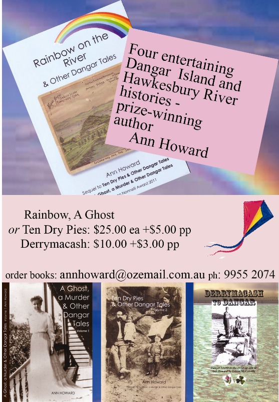 Following the poularity of A Ghost, a Murder & Other Dangar Tales and Ten Dry Pies & Other Dangar Tales, popular award winning author Ann Howard, from Dangar Island, has published Rainbow on the River and Other Dangar Tales and Derrymacash to Dangar.Rainbow has startling new historical facts eventuating from a chance meeting with a ninety year old lady who had lived on Dangar Island in the 1930s as a child, with original photographs. Derrymacash is a true account by a little girl living on the Island in the 1950s. Her Irish father had fled the Black and Tans. Her Scottish mother was strict, but she and her twin sister behaved as badly as they could manage. This charming, funny account also has original photographs.