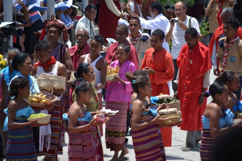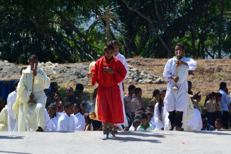 There is an American man here high up in the Vatican who serves the Pope, and three other bishops from Dili and other regions of Timor. The music is again an act of heaven, yet I still feel a separation, a still disconnectedness here. Walking back down, I have to keep telling myself not to collapse – it requires conscious thought. Waiting for the bishops to arrive before the big feast is the most excruciating wait I have ever experienced. The food has been waiting for us in this heat for ages; coconut rice, capsicum, purple rice, fresh salads, meats of all sorts – maybe some fish from the river...