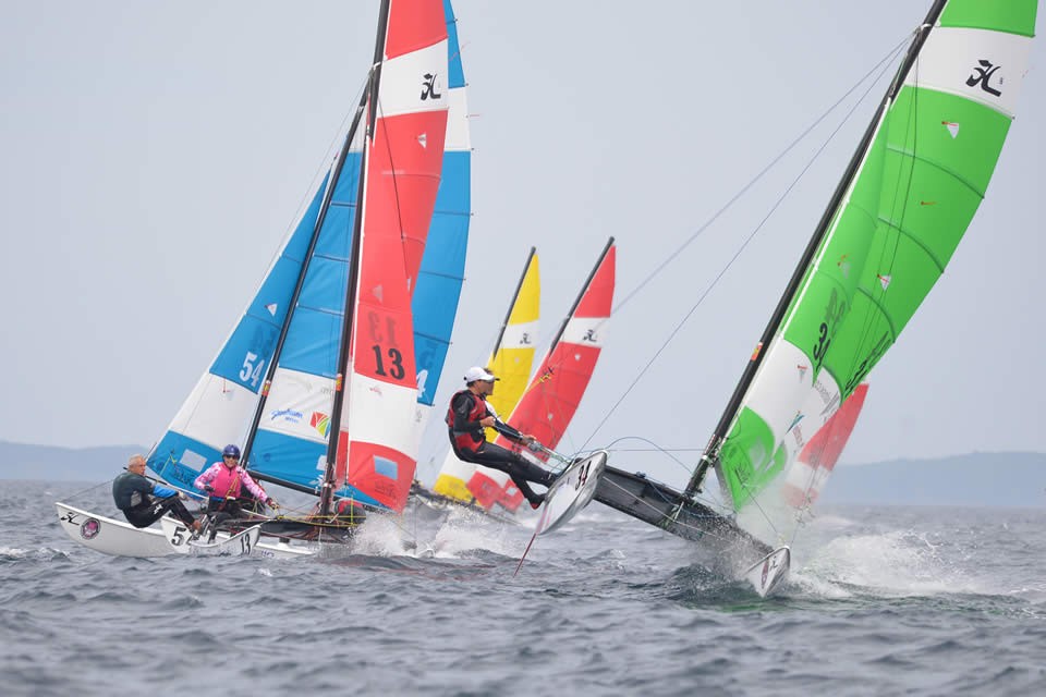 In Race 13 Jason Waterhouse and Lisa Darmanin again took the top spot in what was a fantastic days racing for the pair as winds freshened and the boats got to stretch their legs giving the sailors some pressure for the last race of the day. Second and third were picked up by Tim Shuwalow from Sweden with Nina Curtis (crew) and Daniel Bjornholt-Christensen and Lachlan White respectively.