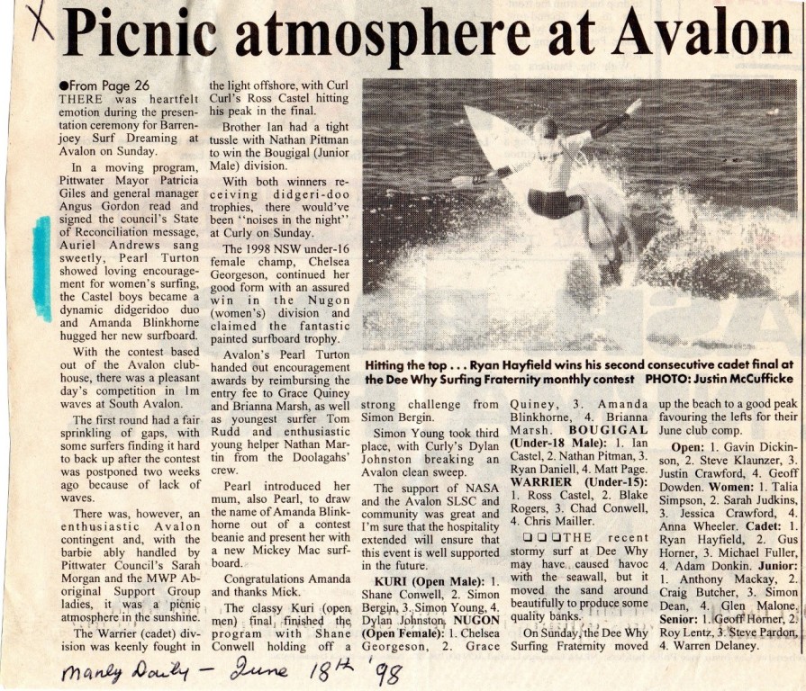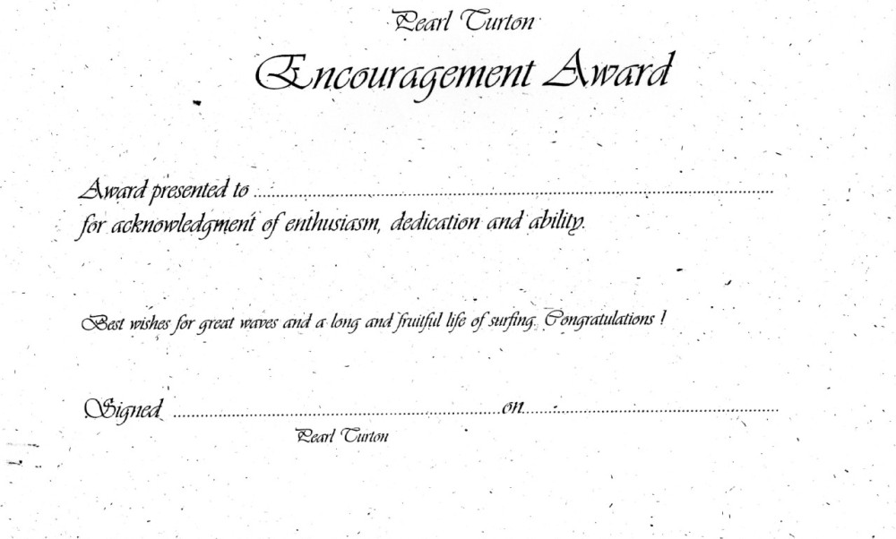 “Pearl would ring me and say ‘I saw this little grommet surfing and she didn’t come anywhere, but she has something – I can see something there, she was really having a good go. She’s getting my Encouragement Award and I’m going to give her something towards entrance fees for upcoming competitions. ’
