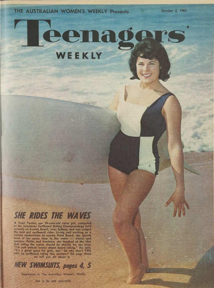 Pearl Turton, our 16-year-old cover girl, competed at the Interstate Surfboard Riding Championships held recently at Avalon Beach, near Sydney, and was judged the best girl surfboard rider. Living and working as a trainee cosmetician at nearby Palm Beach, she spends most of her spare time in the water - winter and summer. Petite and feminine, she laughed at the idea that riding the waves should be strictly for the boys. "I'm just stoked (crazy) about board-riding," she said. "It's a great sport for girls, too." So why don't YOU take up surfboard riding this summer? On page three we tell you all about it.