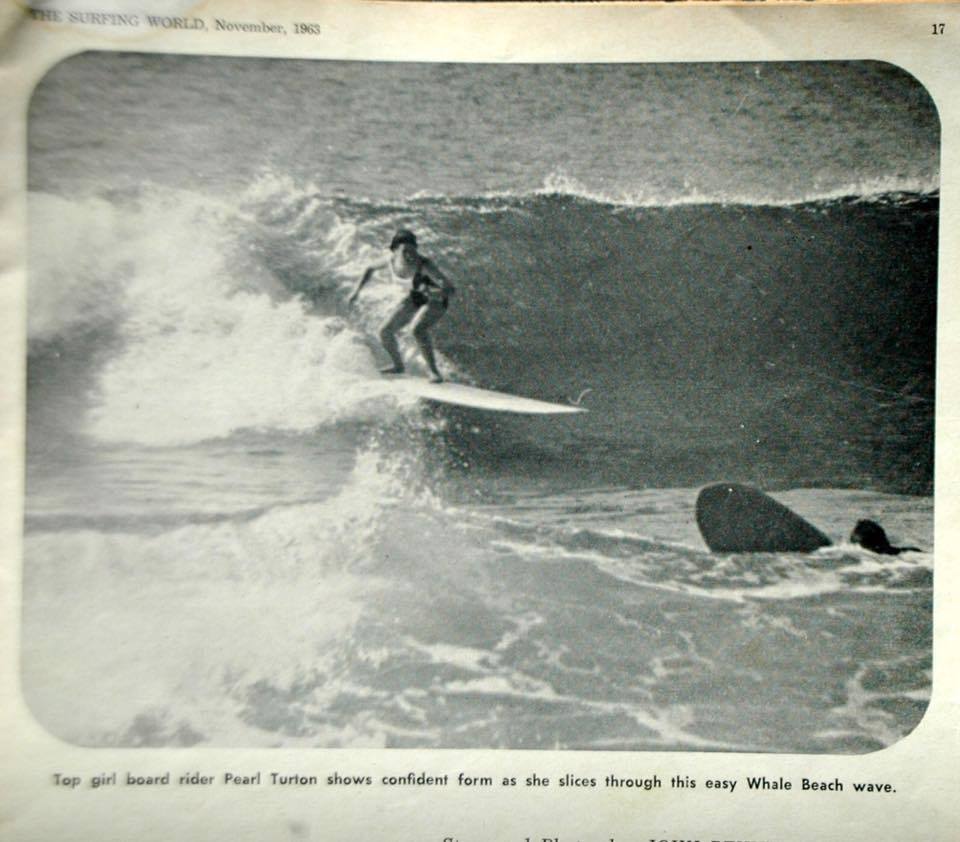 1963 Womens Interstate Champion Pearl Turton in action at Whale Beach the same year - clipping from The Surfing World, courtesy Ron Turton